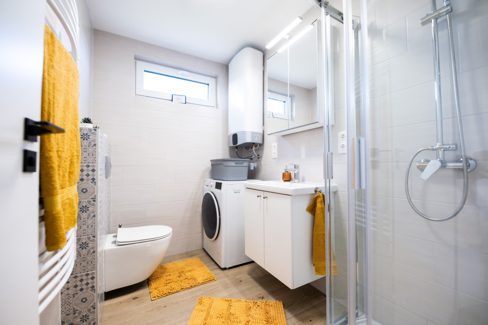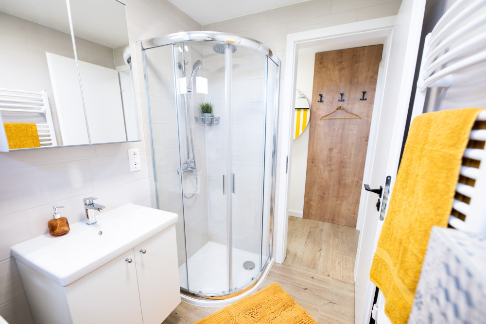 - Badezimmer: 4 Steckdosen, eine Wandleuchte über dem Waschbecken