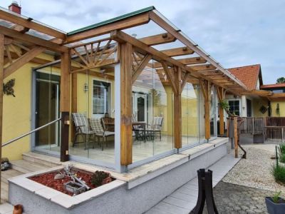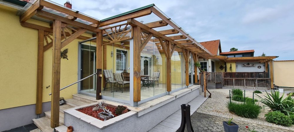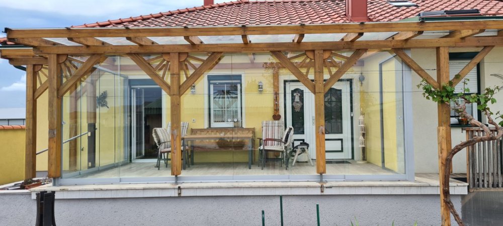 Diesesmal haben wir eine spezielle Aufgabe bekommen. Der Kunde hatte bereits eine vorhandene Holzüberdachung die er abschließen wollte um so die Terasse besser ausnutzen können. Der Hauptaspekt war, dass man bei Bedarf die Durchgangsbreite wieder offen haben kann. Aus dem Grund ist die Wahl auf den nurglas System gefallen. Mit diesen System kann man die Flügel hintereinander schieben und an eine Seite sammeln, dank der mehrschienigen Ausführung. So wurde die traditionelle Holzkonstruktion mit der modernen Aluminium Glas Elemente kombiniert und dass Ergebniss wurde einfach wunderschön.