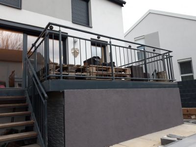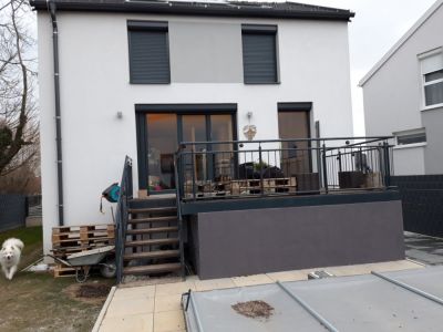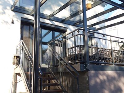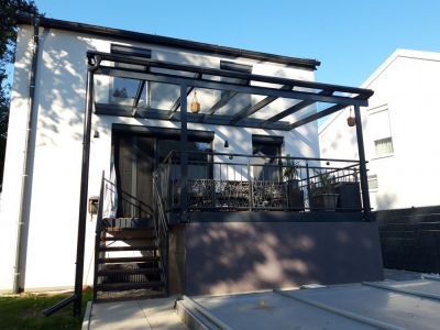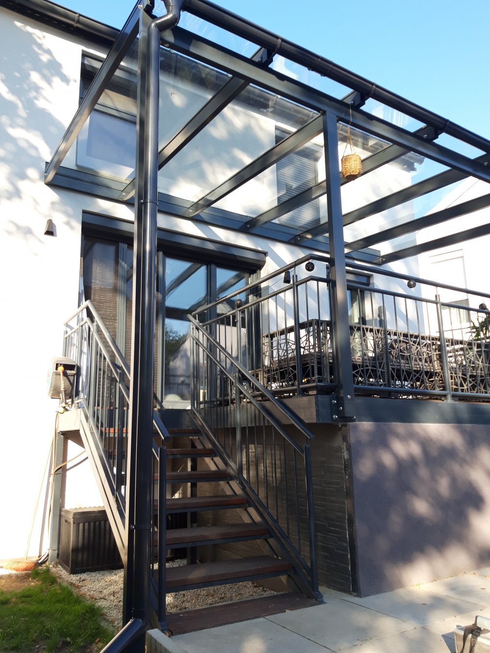 Mit unserem Aluminium Überdachungsystem können wir Ihre Terasse unabhängig von Form oder Größe abdecken. Auf Kundenwunsch wurde diese Überdachung auf Antrazit Farbe beschichtet. Bei dieser Überdachung konnten die Haltesteher nicht die selbe Länge haben wegen der Treppenaufgang. So wurde ein Steher länger geplant , und auf die Treppen befestigt. Die weiteren zwei Steher wurden natülich auf die Terasse platziert. Wegen der Breite der Überdachung waren drei Steher auf jeden Fall notwendig aus statischen Gründen. Die Konstrutkion wurde mit einem minimalen Dachvorsprung Ausgeführt. Das Regenwasser wird vom Dach in die Regenrinne abgeleitet, die natürlich auf die selbe Farbe beschichtet wurde wir die Überdachung.