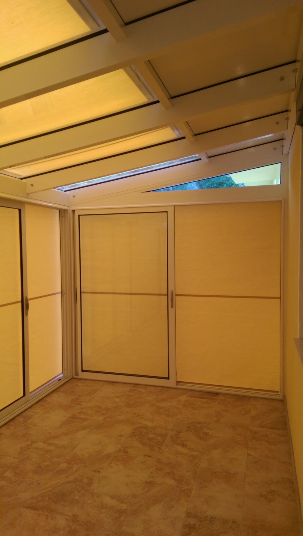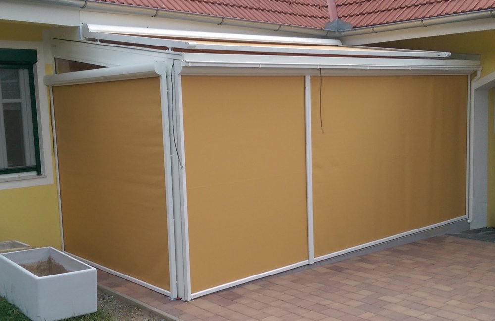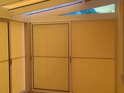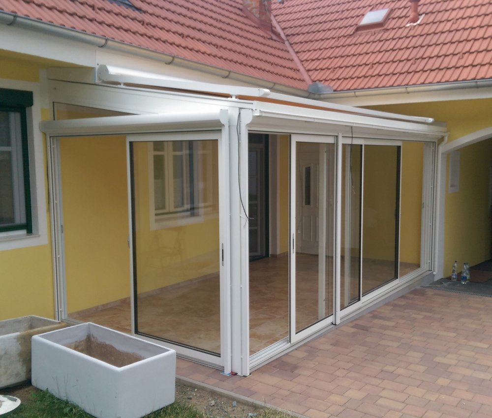 Aluminium Sommergarten mit Oberglasmarkise, und Senkrechtmarkise, damit es auch im Sommer in den Innenraum kühl bleibt