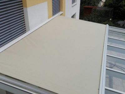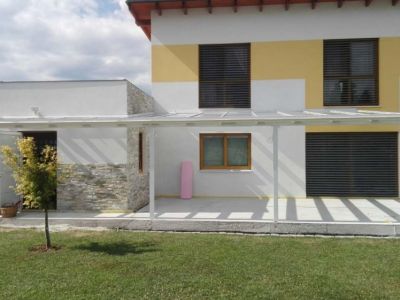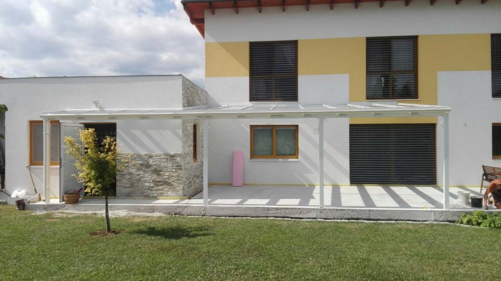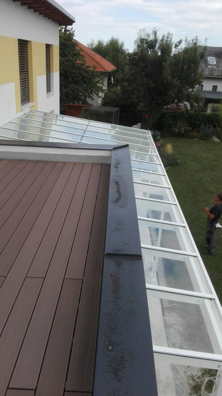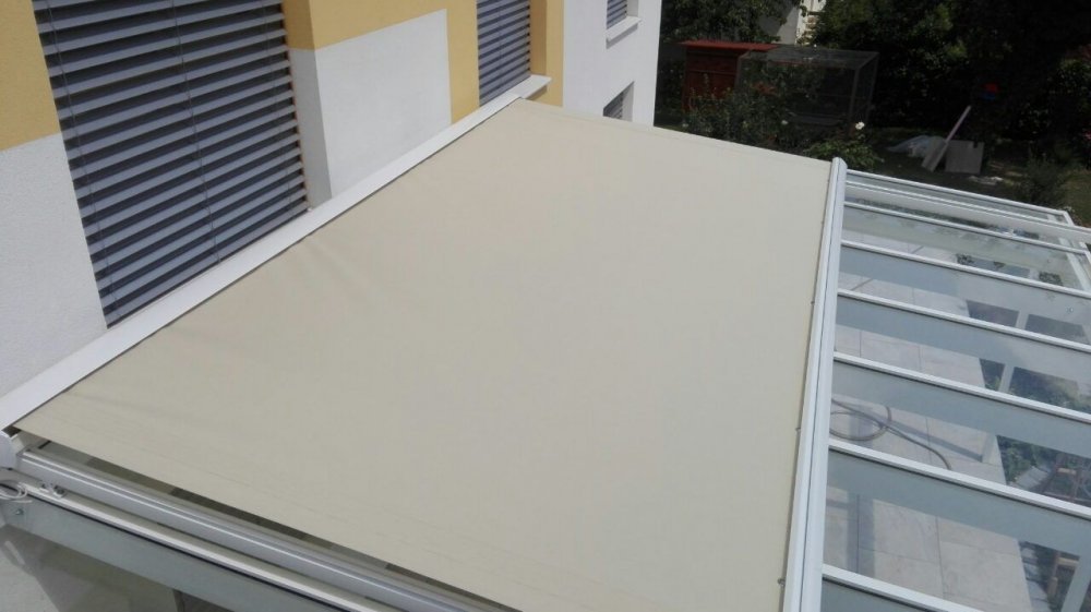 Diese Überdachung hat einen speziellen Form und geht über die ganze Terasse.Damit  die Terasse im ganzen Jahr benutzt werden kann auch im Sommer hat unser Kunde eine Markise noch bestellt.