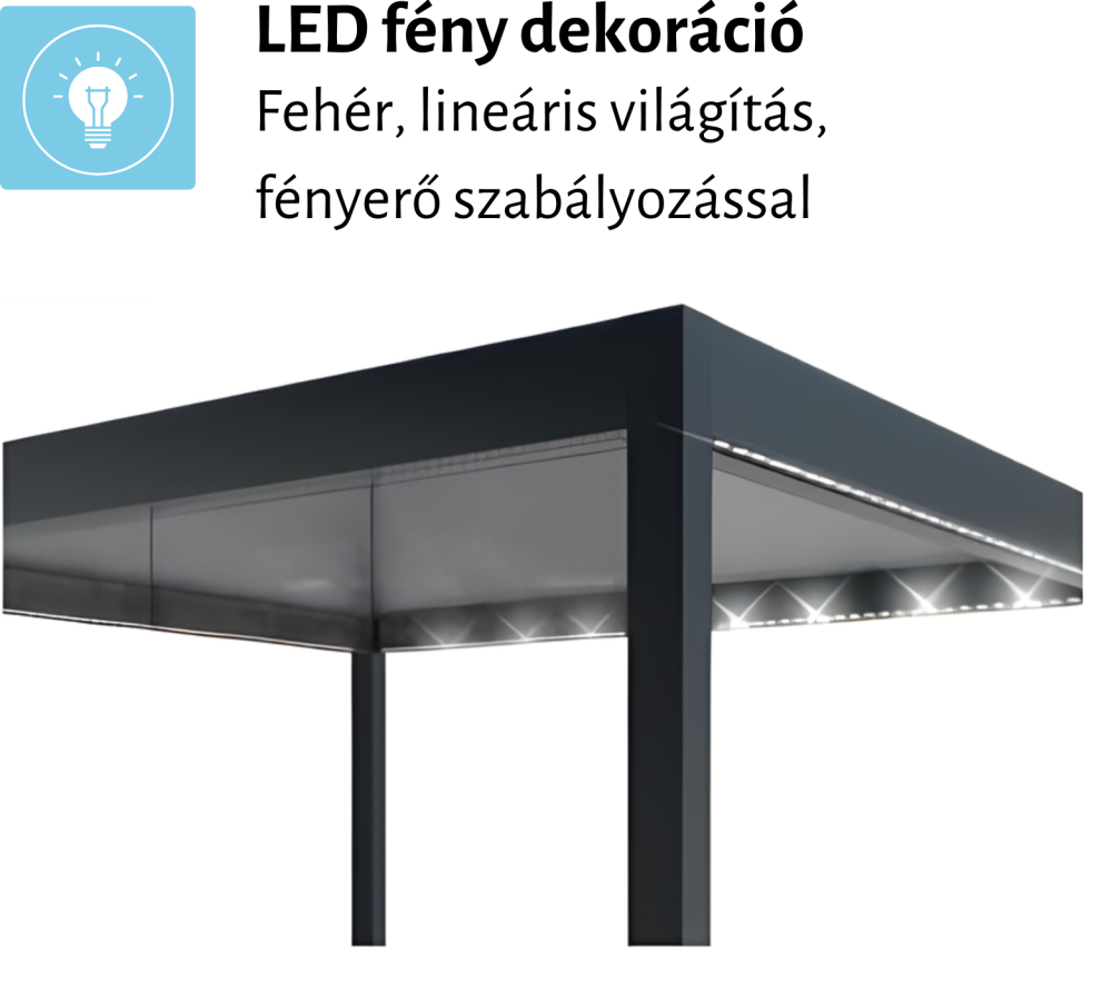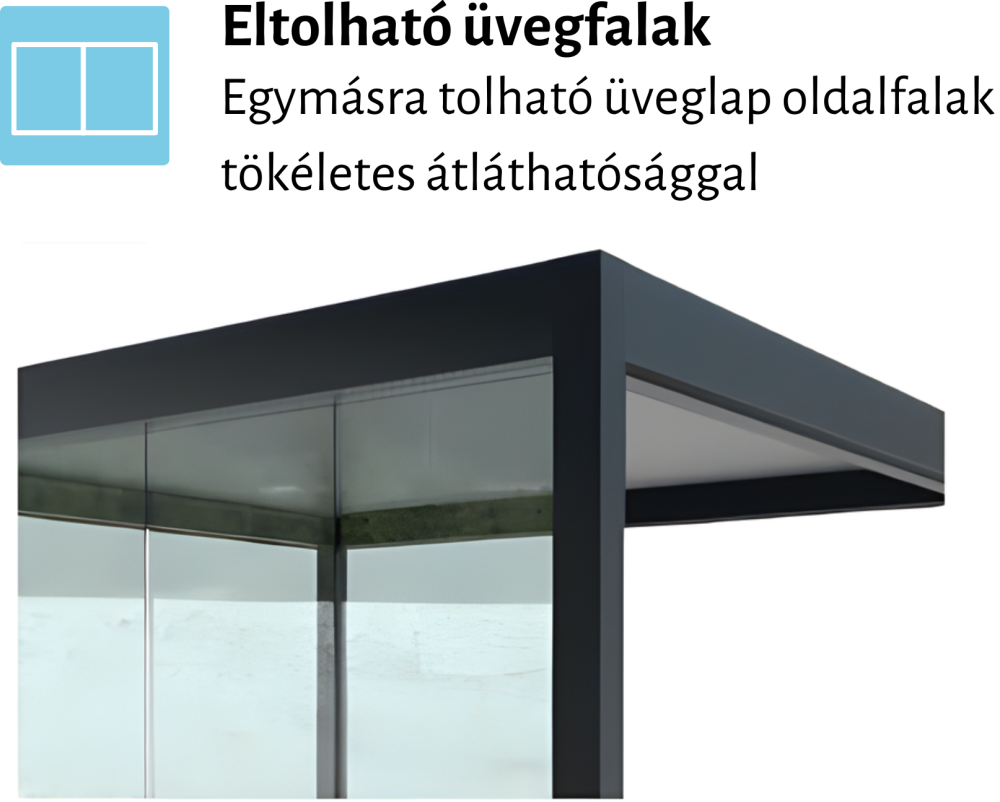 - beépíthető kényelmi elemek: hősugárzó, LED lineáris világítás, Zip Screen oldalsó árnyékolók, fix lamellás panelek és eltolható üvegfalak