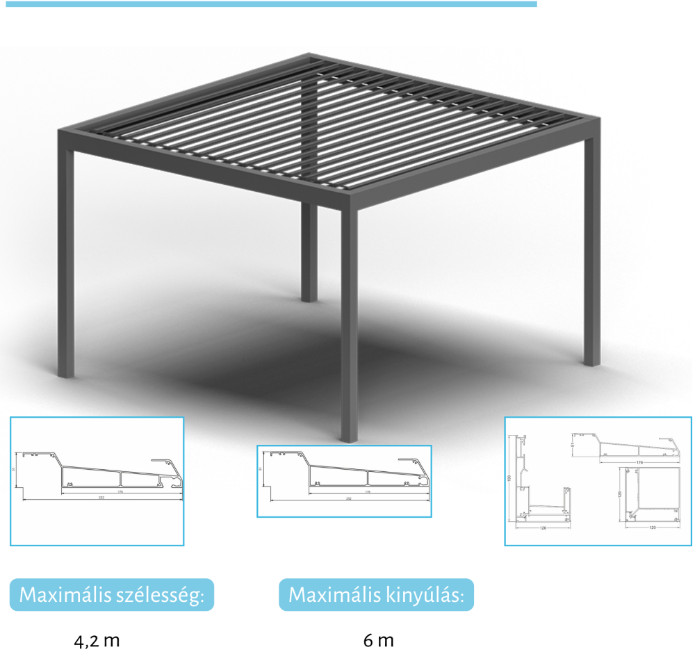 - a pergola teteje mozgatható, kamrás alumínium lamellákból áll